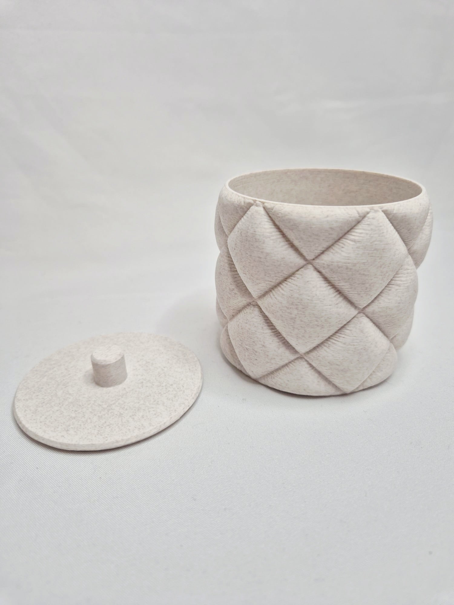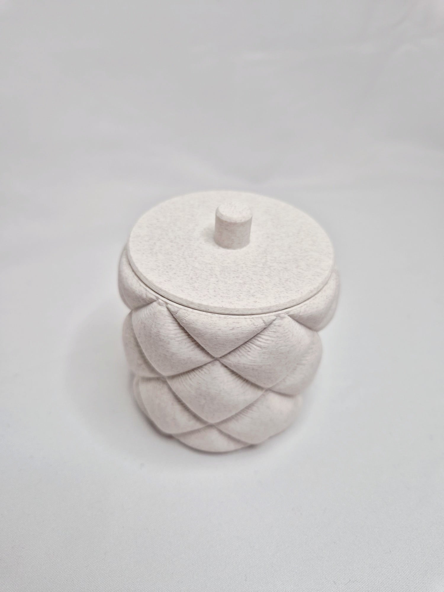 3D Printed Cotton Pad Holder with Lid β Quilted Cylinder in Cedar Speckle PLA | Handmade in UK