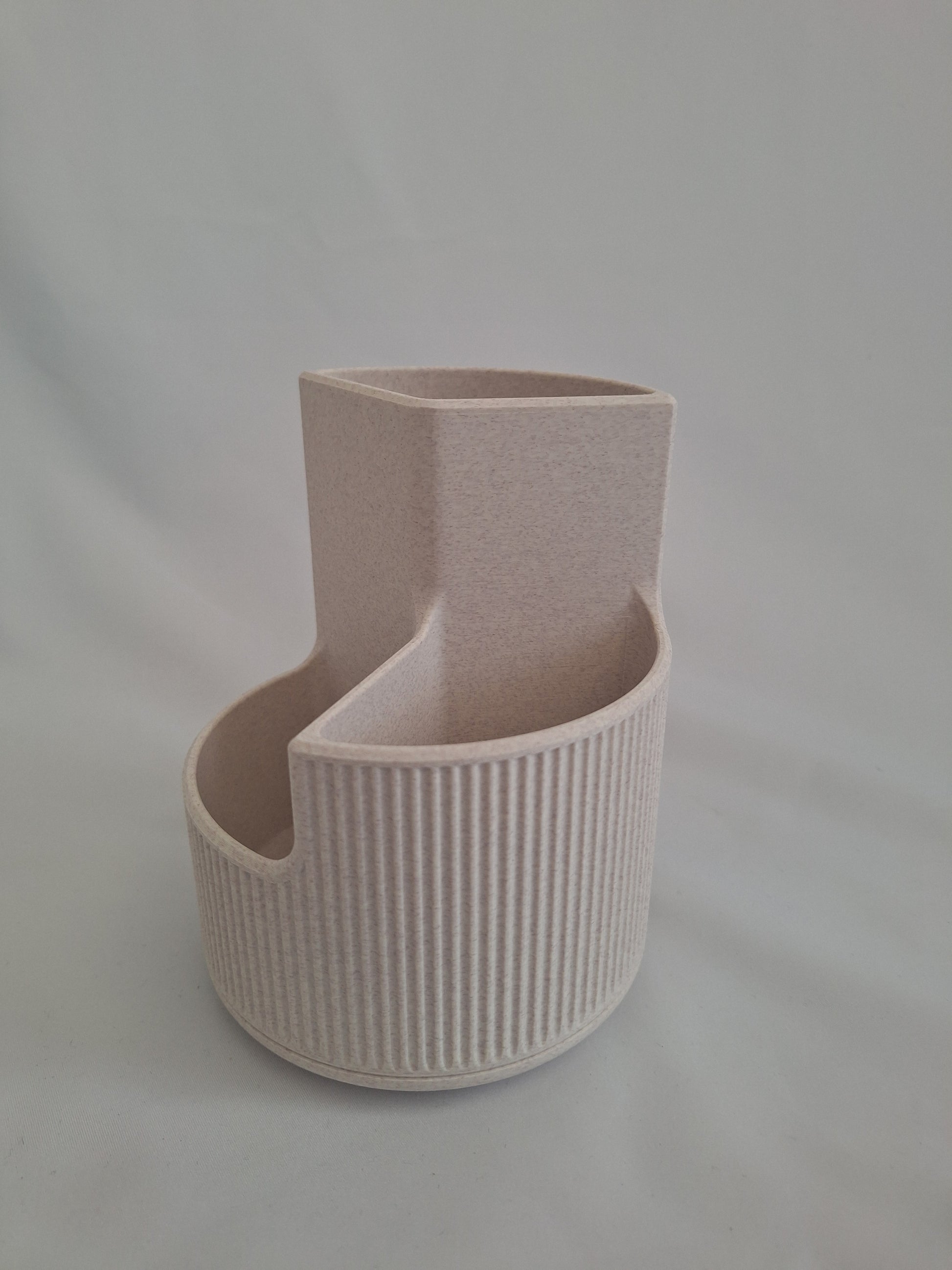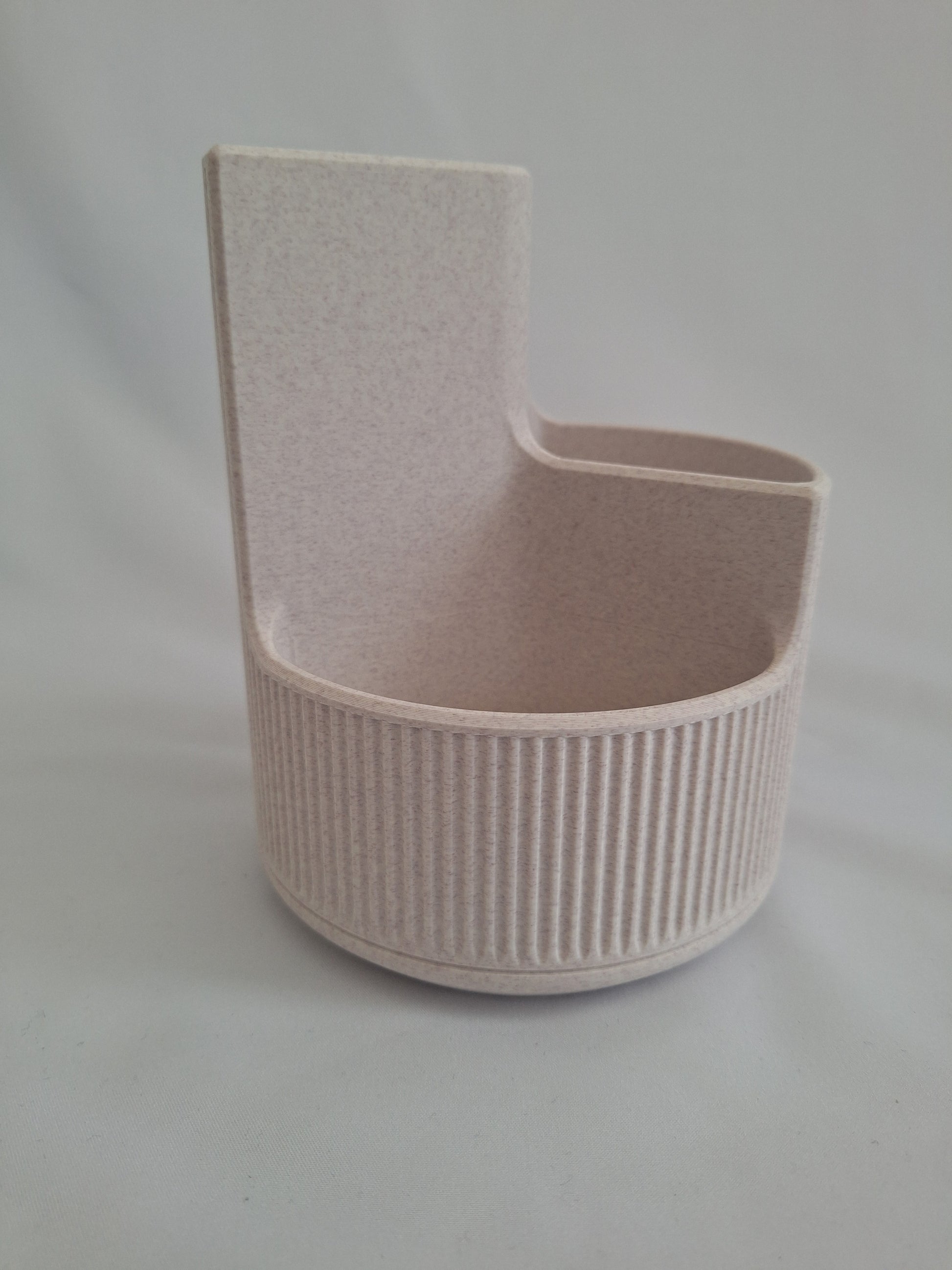 3D printed makeup brush holder, Marble white with cedar speckles, 3 compartments, ribbed design.