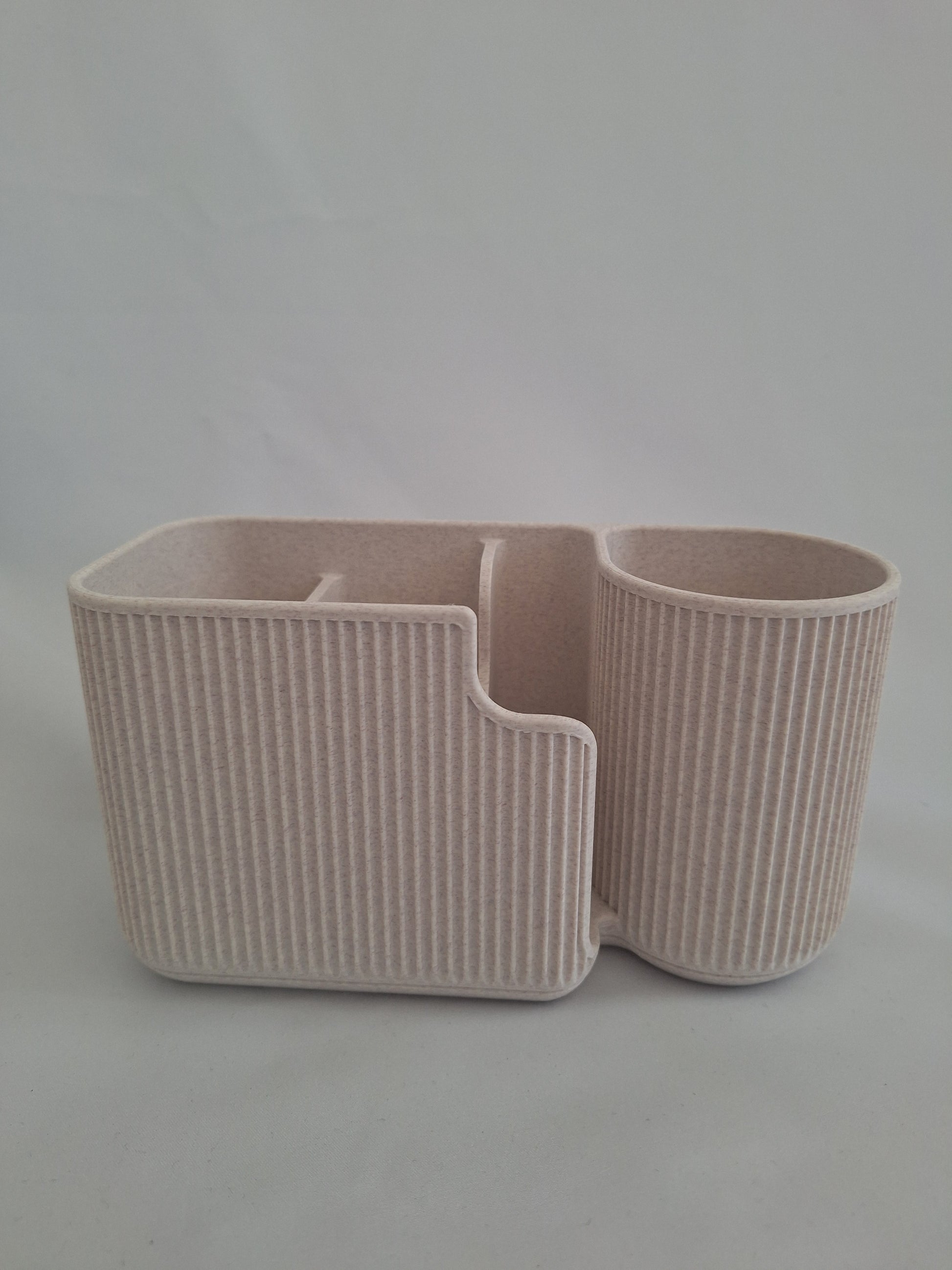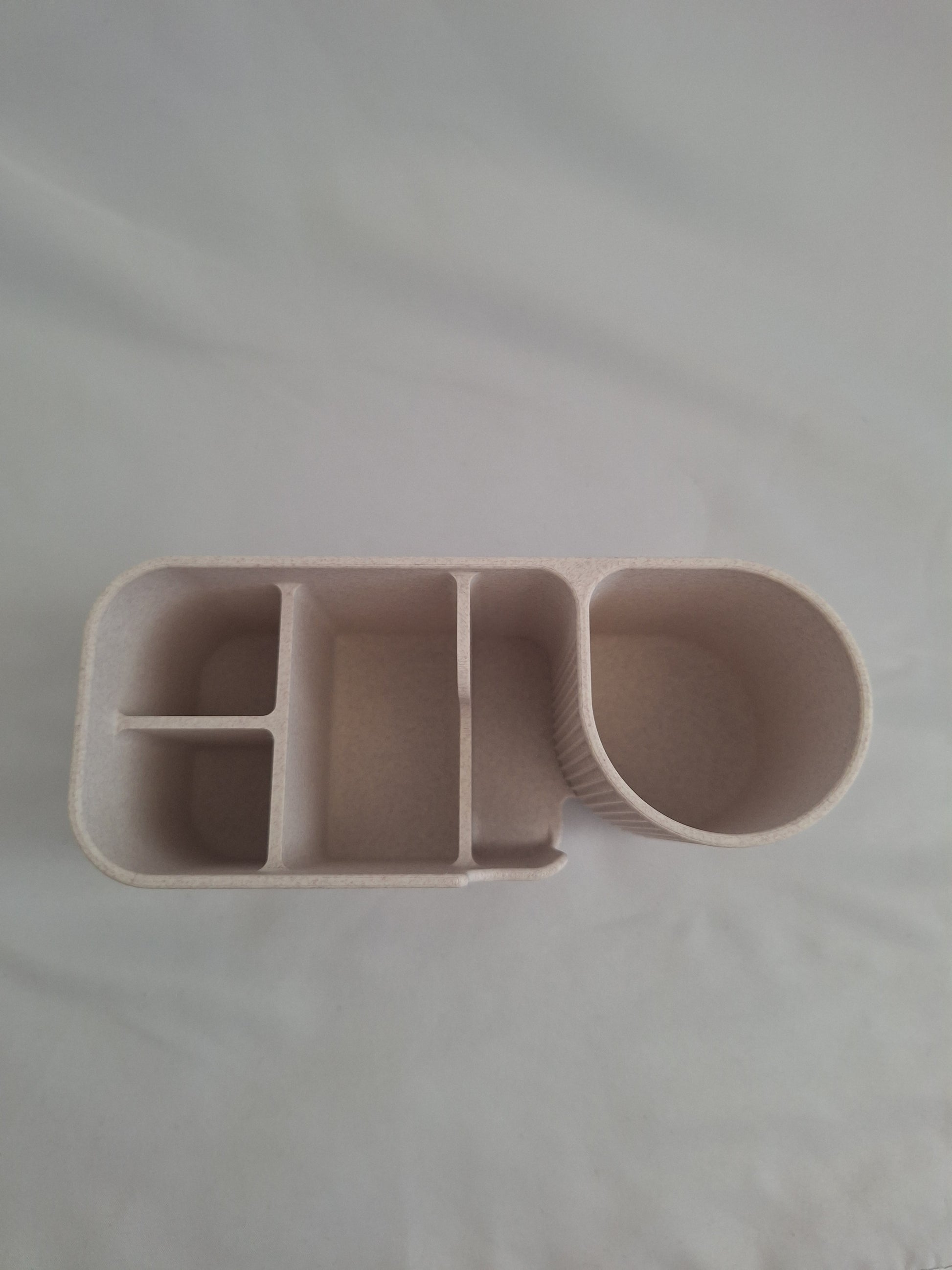 Organise your bathroom in style with this elegant 3D-printed bathroom organiser in a white marble finish with subtle cedar speckles. Designed for both function and aesthetics, this oblong tray features 5 compartments, including a round slot perfect for a small soap dispenser, toothbrushes, cosmetics, or skincare items.