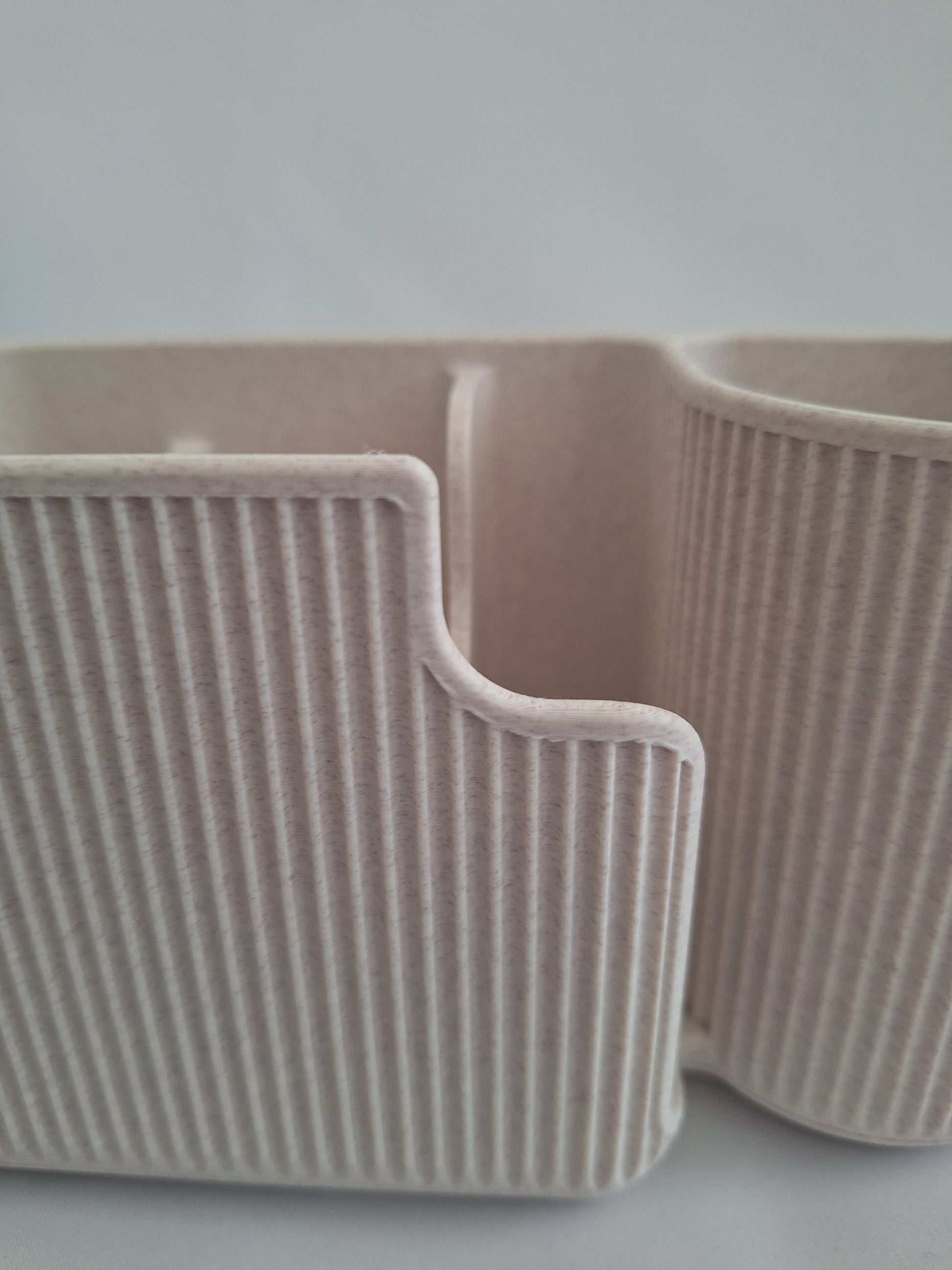 Crafted in a sleek vertical ribbed pattern and finished with softly rounded corners, this compact organiser fits beautifully on any bathroom shelf or countertop.